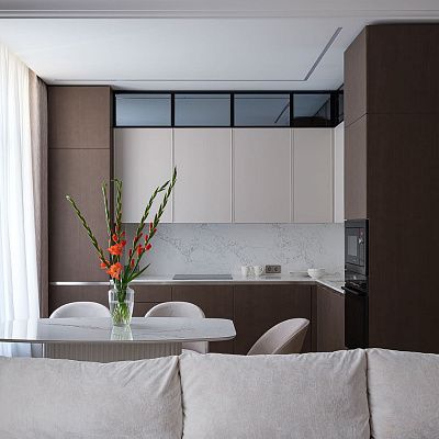 Для данного проекта выбрали кухню Kant светло-серого оттенка за ее строгий, сдержанный дизайн. П-образное расположение позволило разместить полный комплект бытовой техники, в том числе 2 холодильника и винный шкаф, много мест для хранения и большую рабочую поверхность, сохранив при этом визуальную легкость.