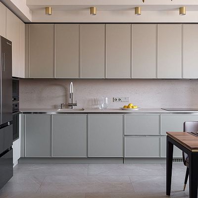 Так и в данном проекте, выполненном в стиле современная классика, в зону кухни выбрали именно эту модель. Сдержанный дизайн гарнитура украшает выраженная фактура шпона Ореха, рисунок которого создан природой.