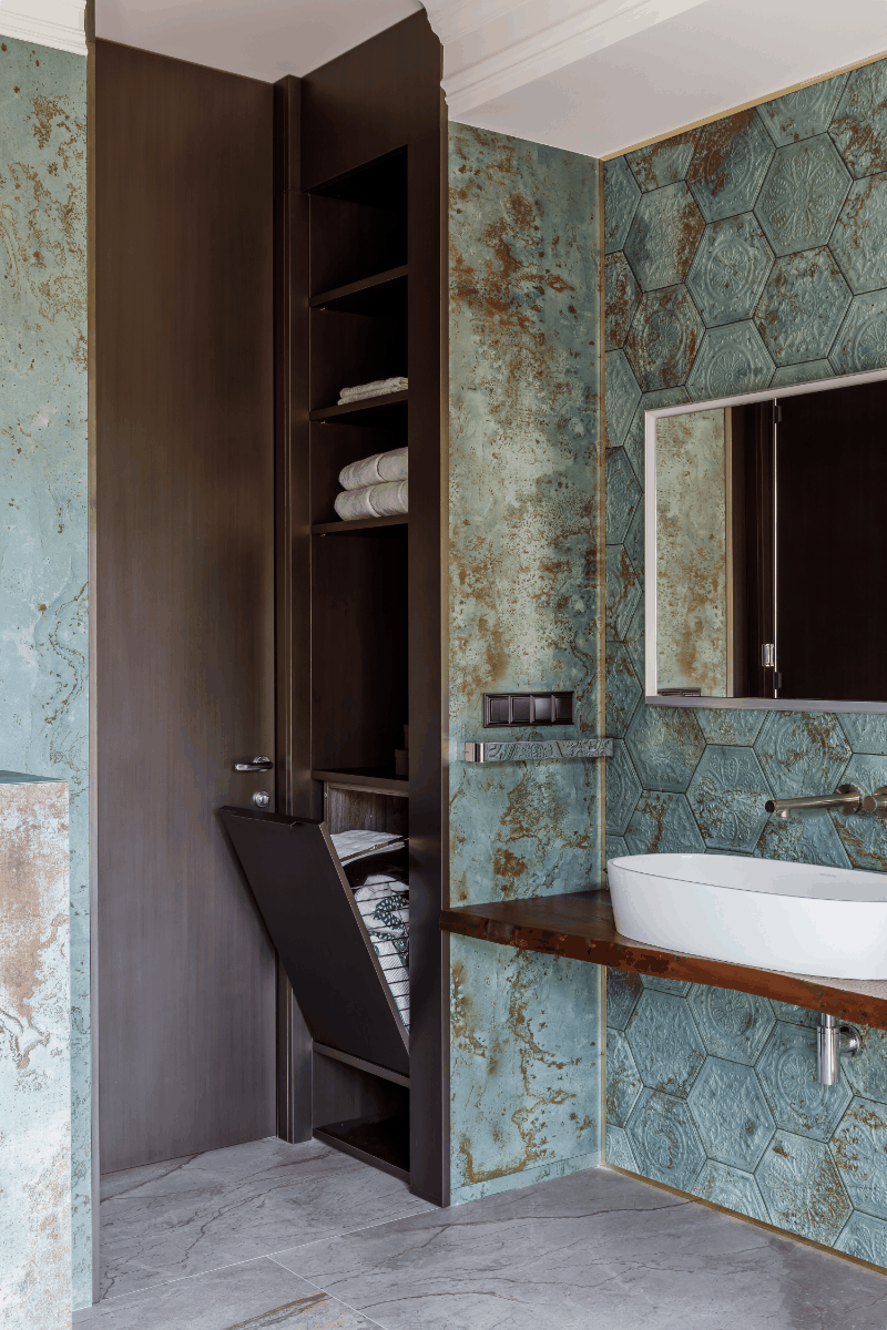Одну из ведущих ролей здесь играет шпон ореха Сатинового с яркой выразительной текстурой. При входе в спальню внимание привлекает большое панно в изголовье кровати, выполненное в технике Маркетри. Этот же орнамент повторили на всех внутренних поверхностях шкафов.