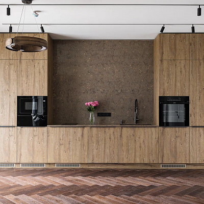 Особый момент проектирования - системы хранения. «На кухне мы использовали всю высоту пространства и вытянули колонны до потолка, тем самым создав дополнительные места хранения под бытовую технику, — комментирует Дарья. — Сам кухонный гарнитур высчитывали до миллиметра с учетом рабочего треугольника и удобства хранения — от винного шкафа и шкафа для бокалов с подсветкой до высоких витрин под посуду и декоративных китайских ваз. А в столешнице установили специальную вставку под доски и приборы.»