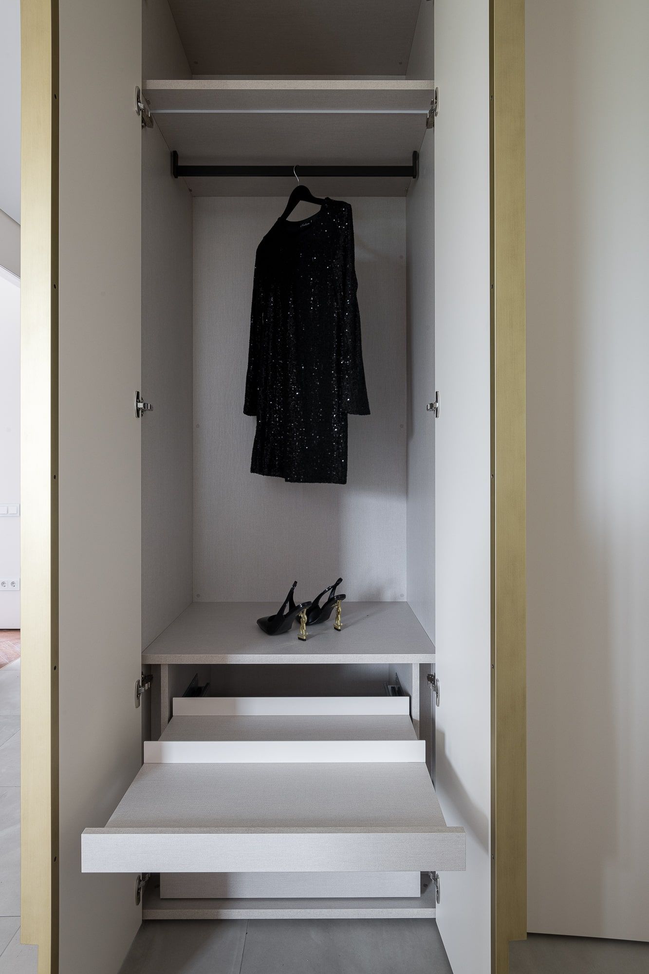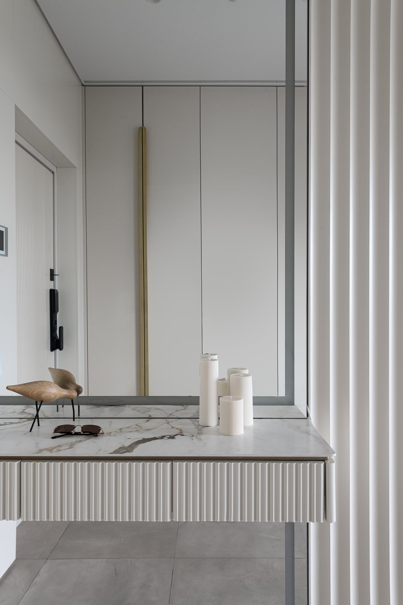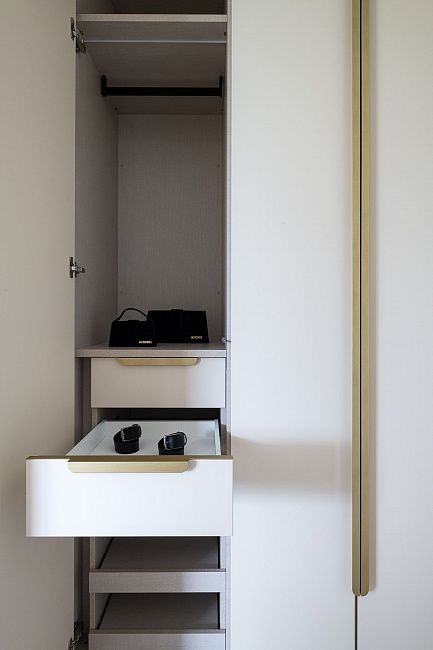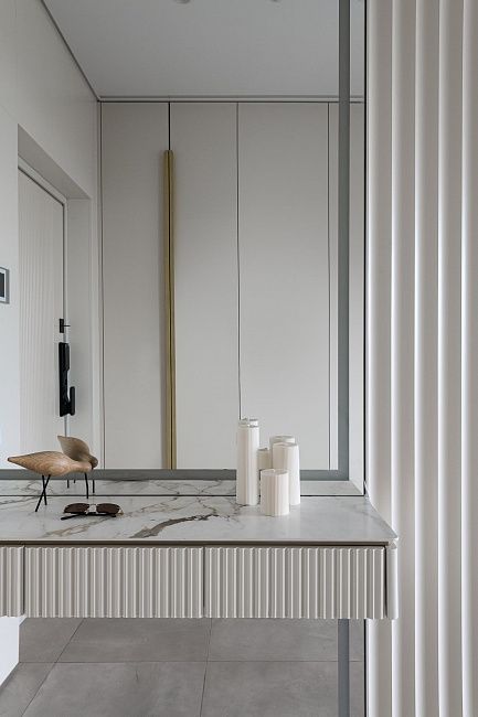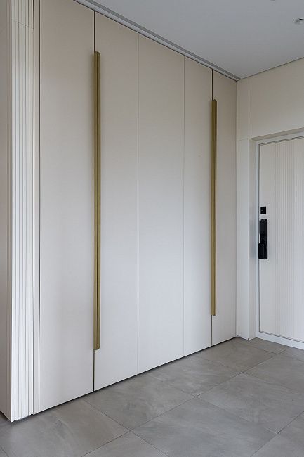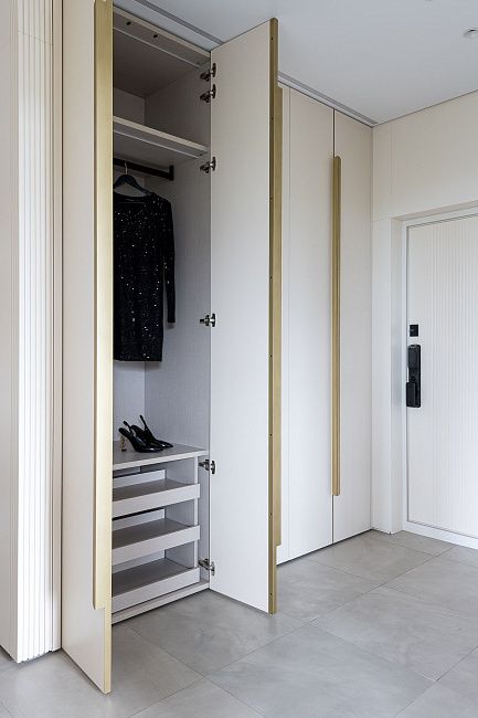 Для проекта также был выполнен гардеробный шкаф в прихожую в том же оттенке, что и кухня.