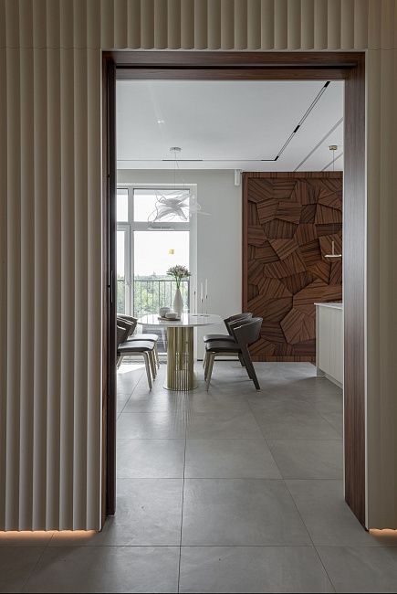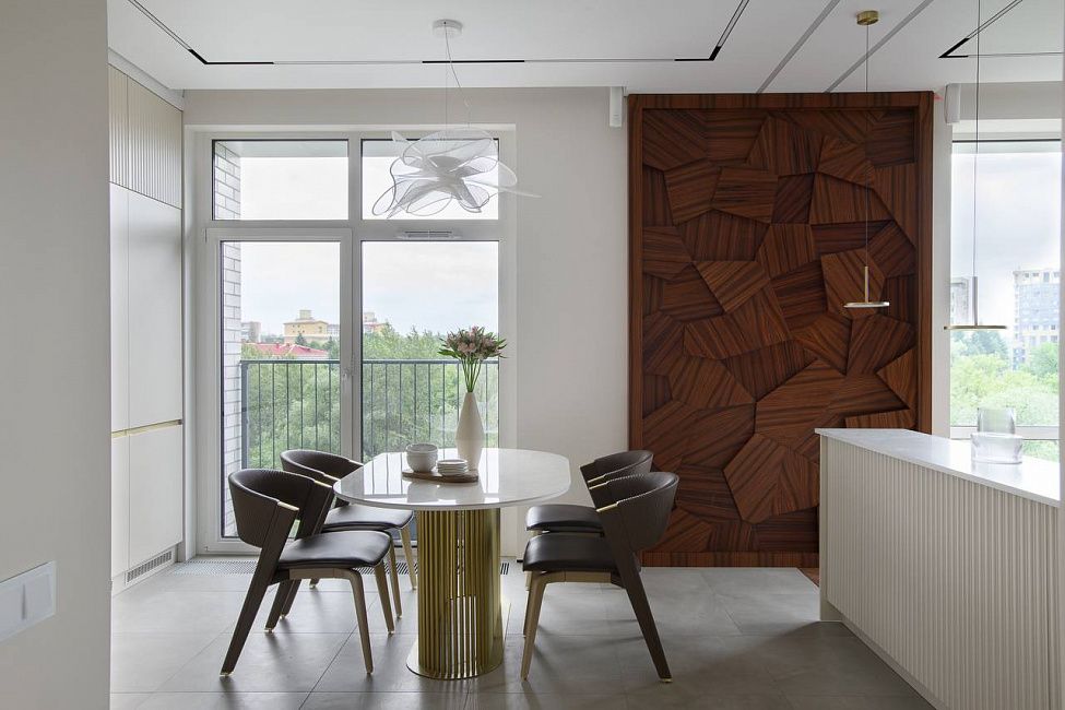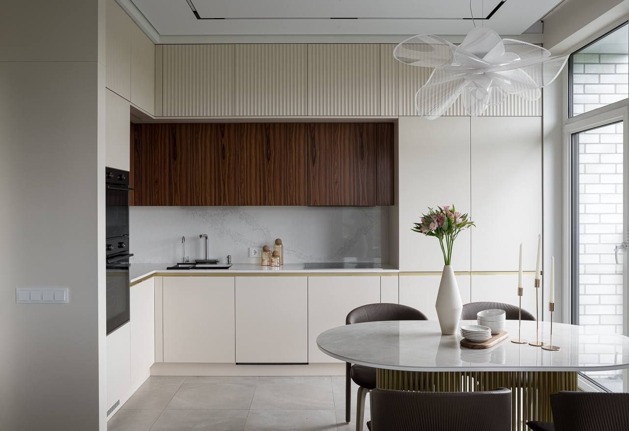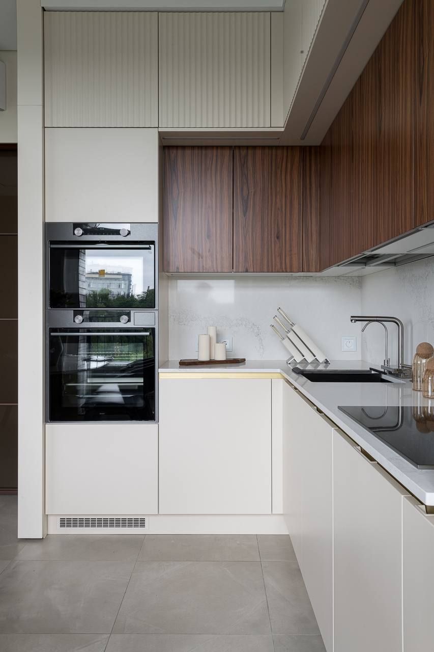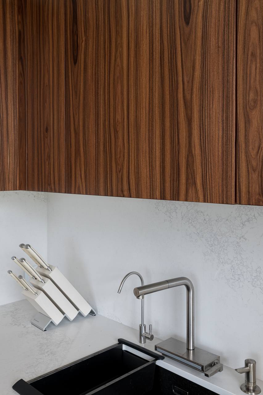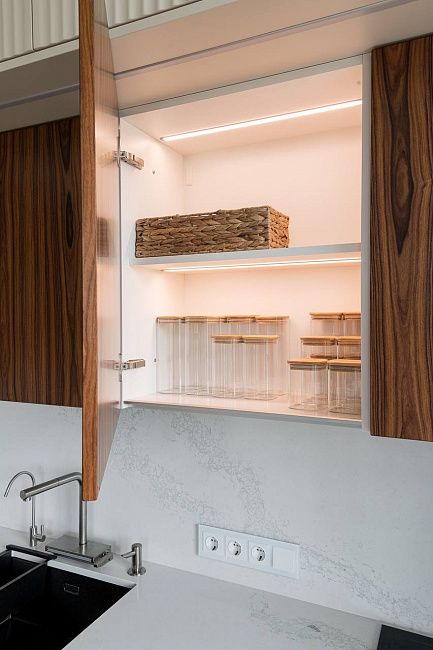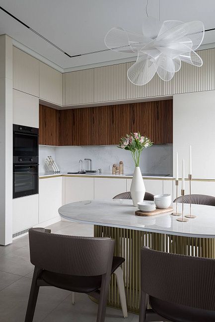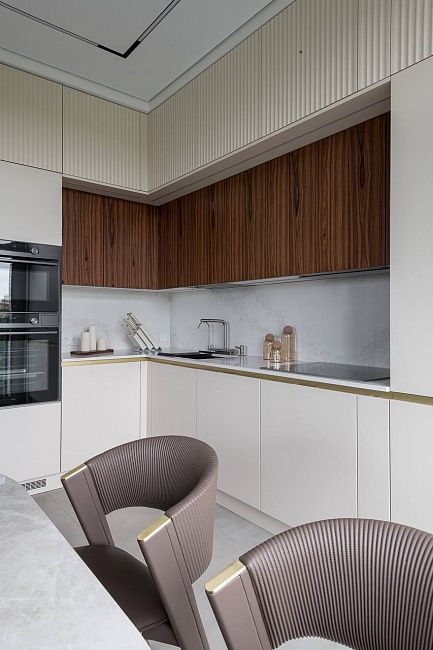 «Кухня должна быть изготовлена из самых качественных и надежных материалов. Она должна быть очень вместительной, но при этом выглядеть максимально легкой, и, конечно же, быть максимально удобной. И нам это удалось! В каждом шкафу есть своя подсветка. Мы разместили тут два больших холодильника, варочную панель, посудомоечную машину умную мойку с системой фильтрации, духовой шкаф, встроенную СВЧ печь и еще осталось место. Фасады верхних шкафов кухни сделаны из шпонированного МДФ, дополняя стену гостиной. Это делает помещение цельным и гармоничным.» - поделился автор проекта.