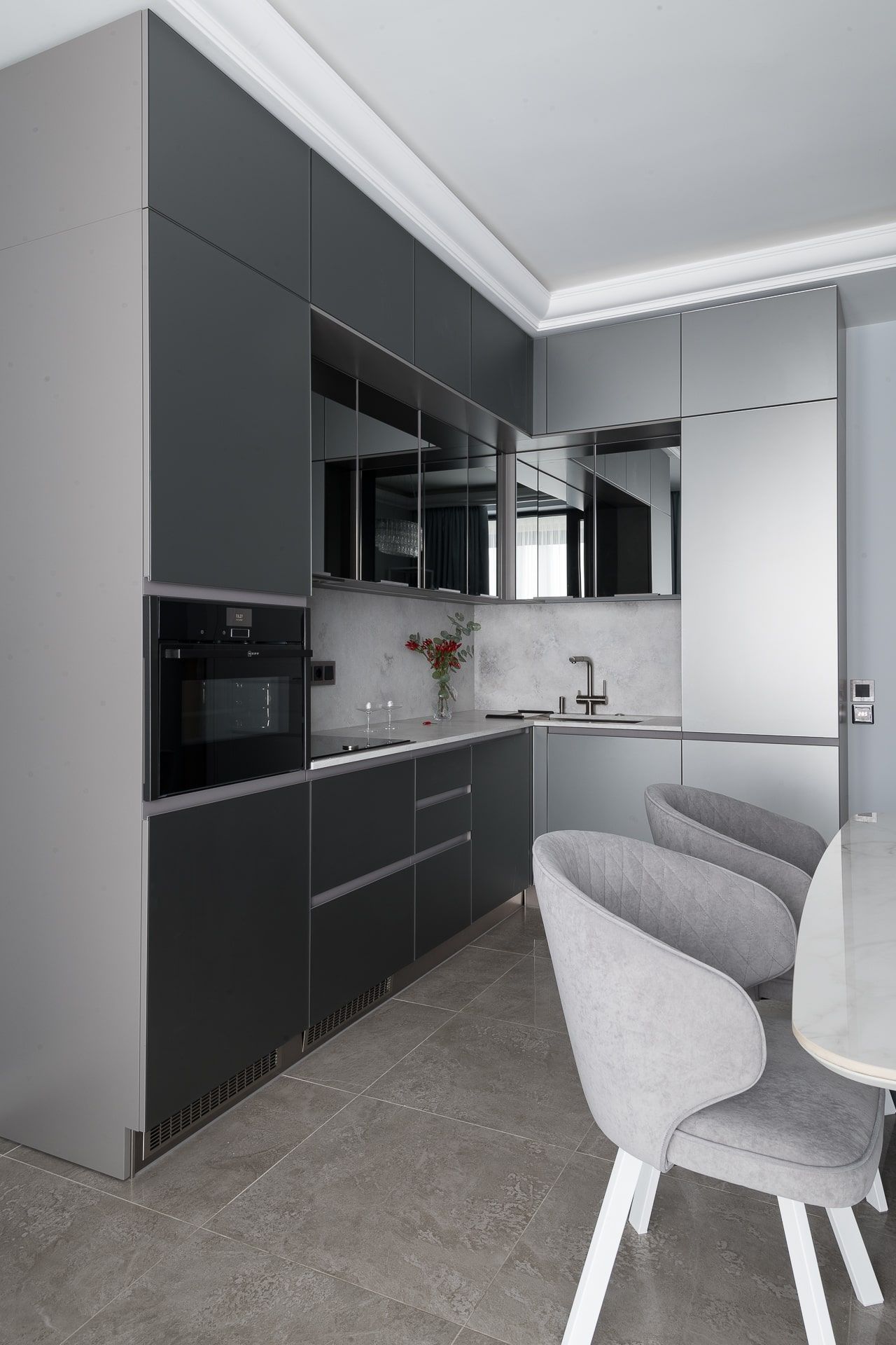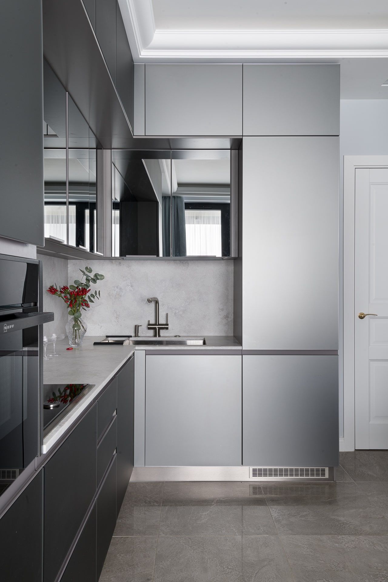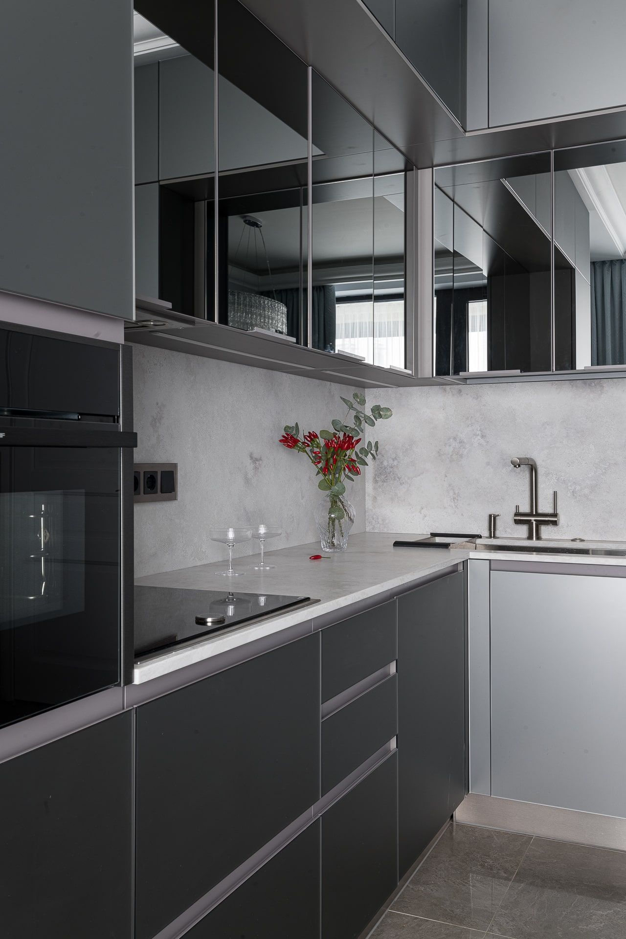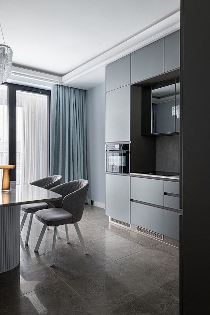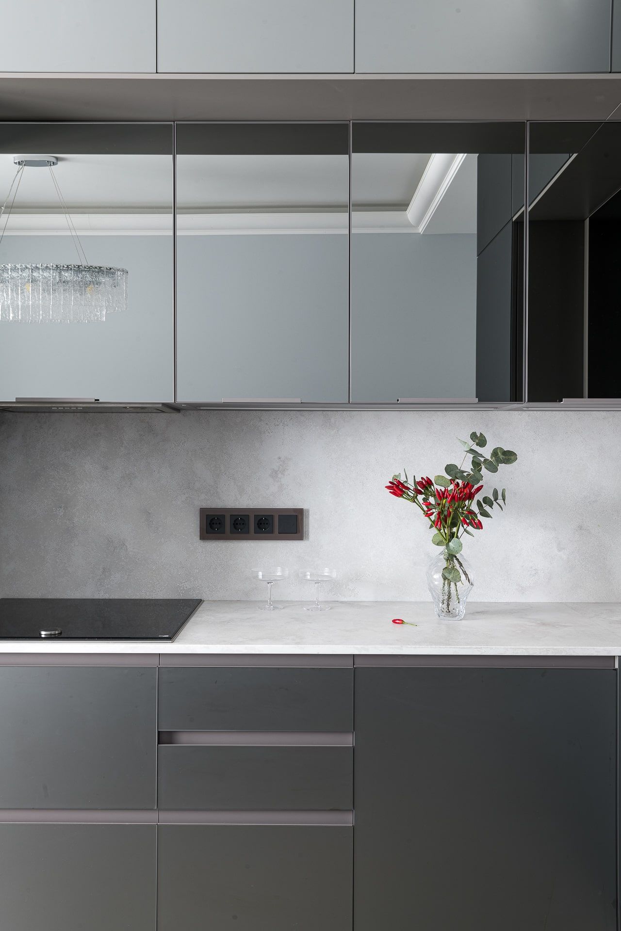 Основываясь на принципах Васту, дизайнер тщательно рассчитала расположение кухни, учитывая влияние энергий восьми сторон света и пяти элементов. Традиционно Васту предпочитает располагать кухню на юге, где преобладает энергия элемента огня, вдохновляющая на достижение целей и реализацию мечт. В этом же проекте изначальное расположение кухни на севере является существенным недостатком, блокирующим приток энергии с северных направлений. Наталия скорректировала северную кухню с помощью легких текстур, стекла и зеркал для трансформации энергетического потока, достигая тем самым гармонии в пространстве и подчеркивая уникальность дизайна.