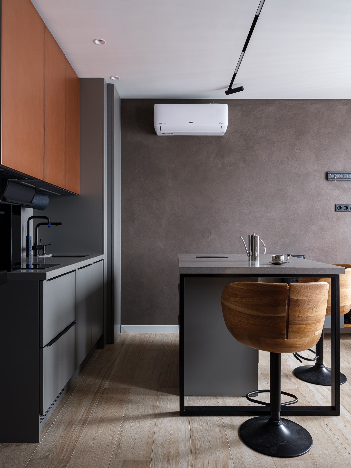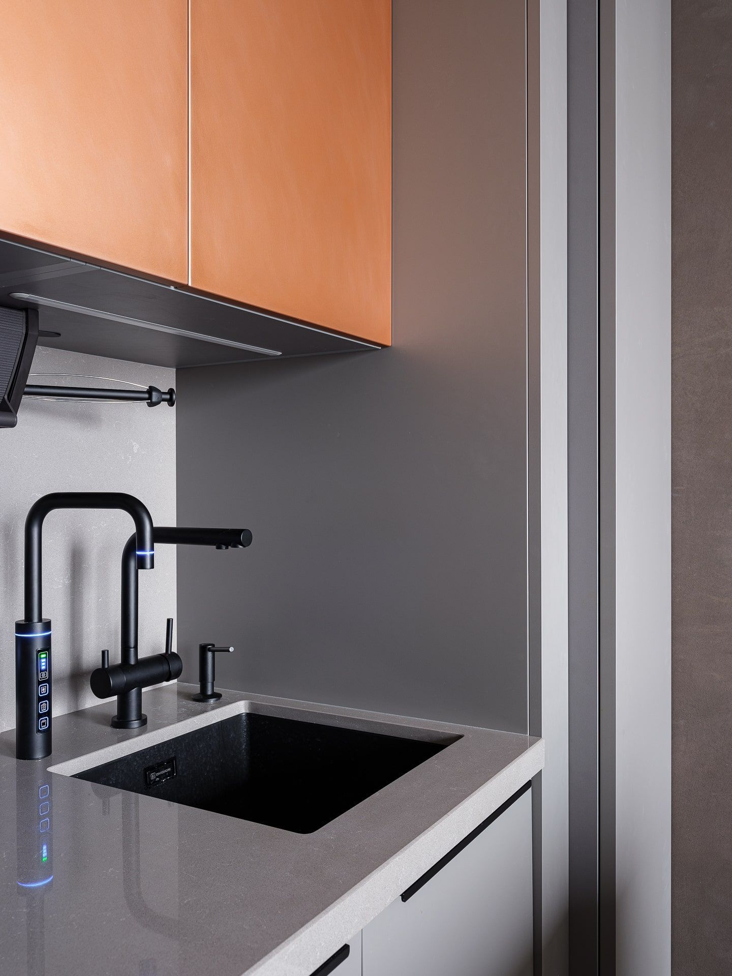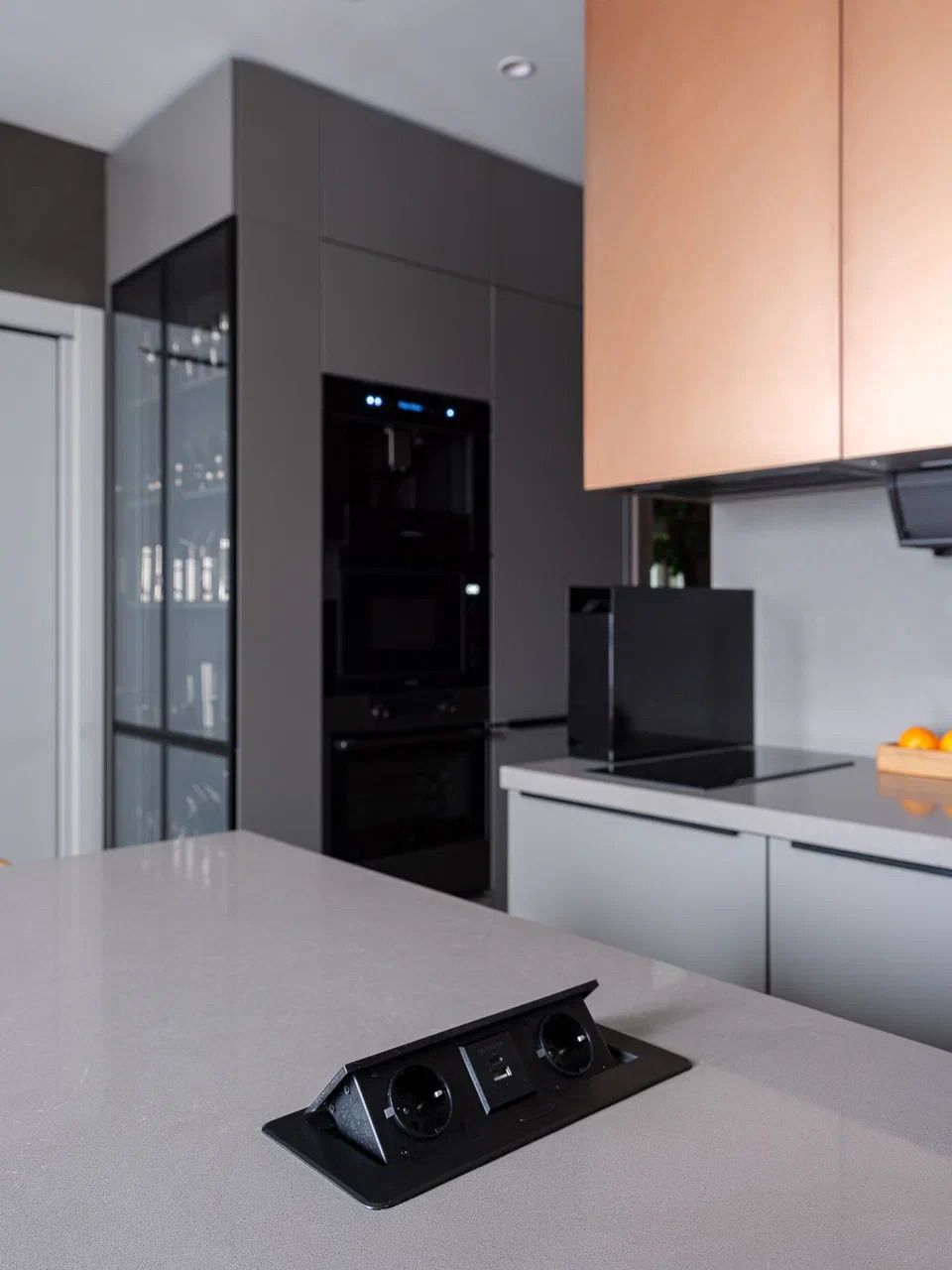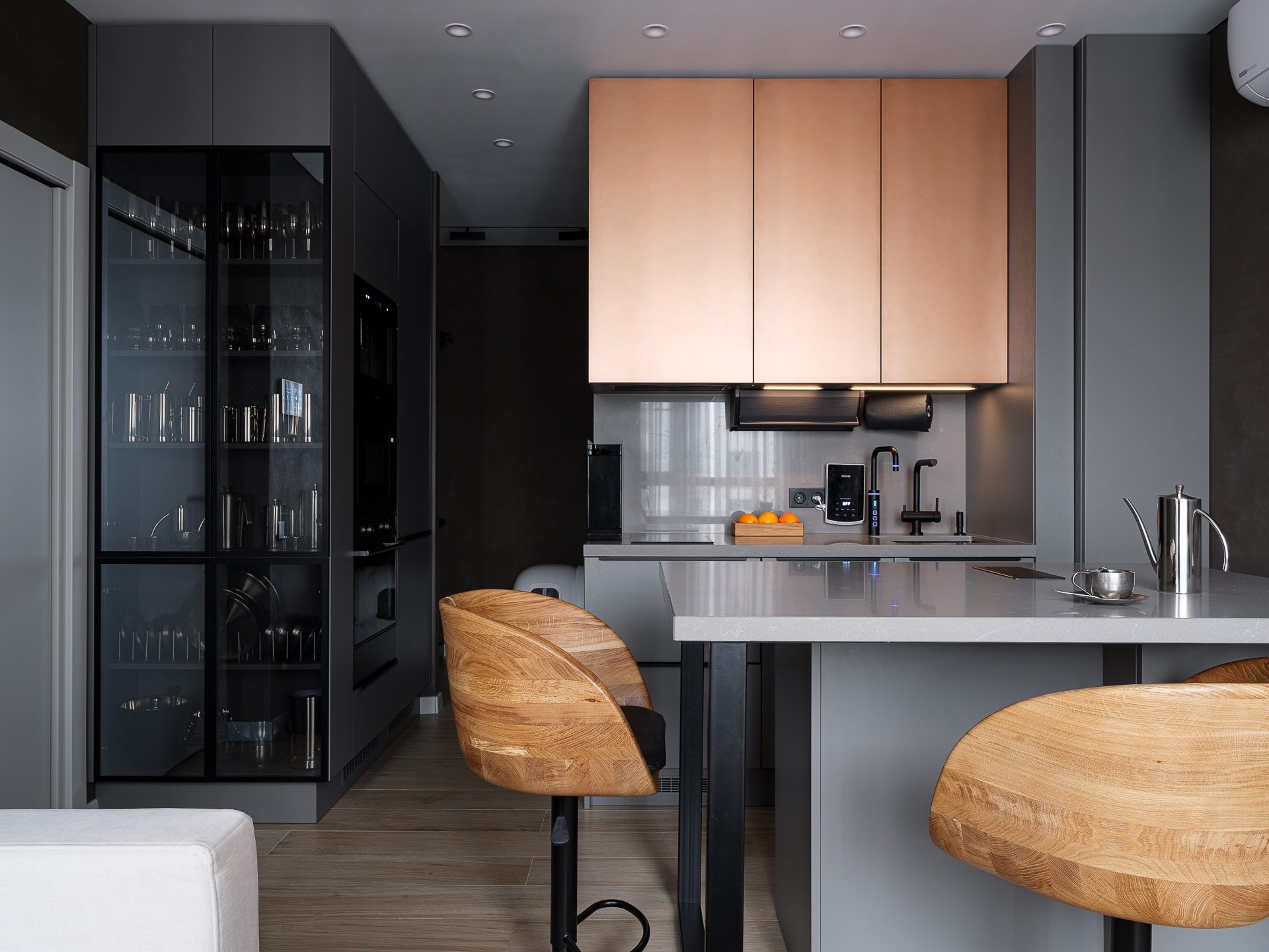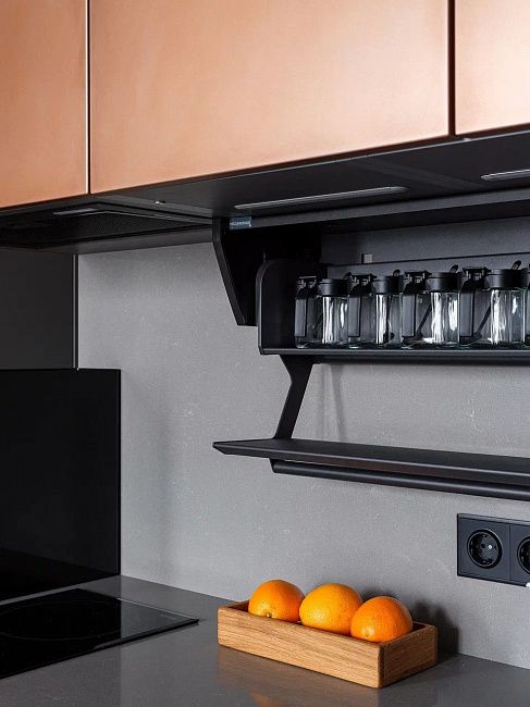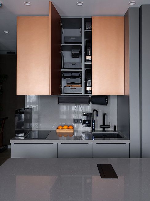 Кухня – это центр внимания. Листая ленту в социальных сетях, Христина увидела нашу коллекцию с медными фасадами и влюбилась. Решение достаточно смелое, но заказчику очень понравилась эта задумка!