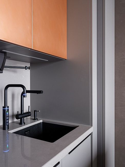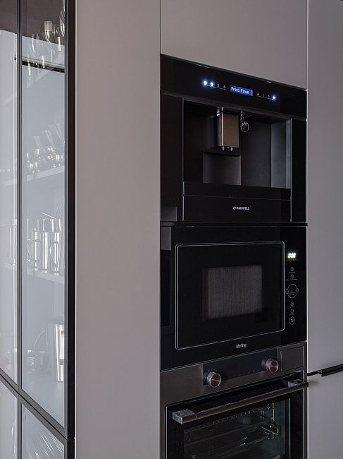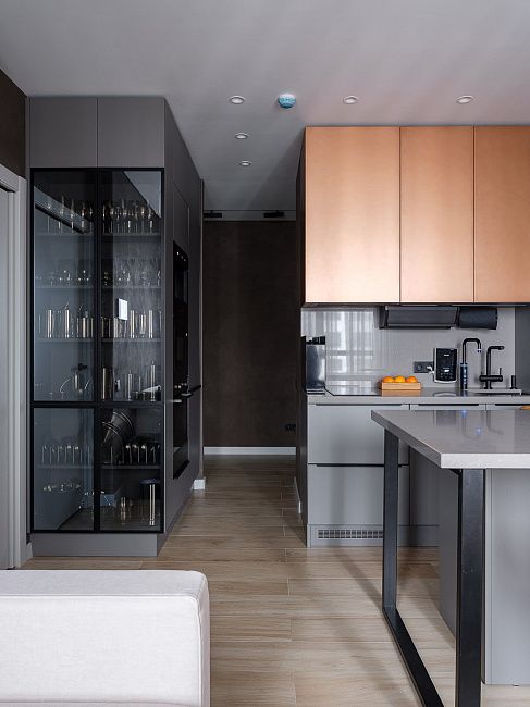 «Мы тщательно выбирали оттенки серых фасадов, которые бы гармонично смотрелись в небольшой кухне. Выступ мы обыграли стеклянной витриной в металлической раме, что притягивает взгляд всех гостей этой квартиры.» - поделилась автор проекта.
