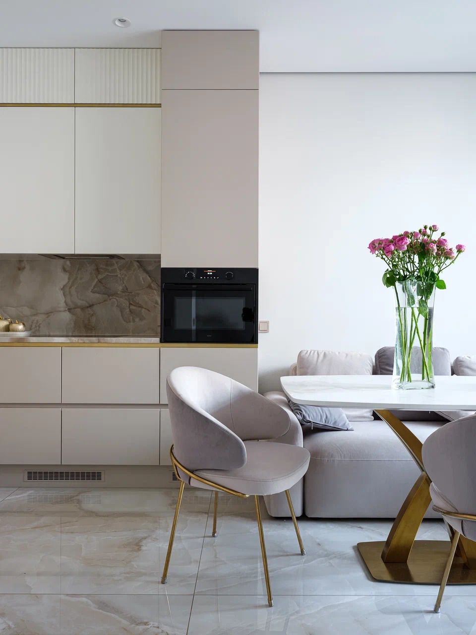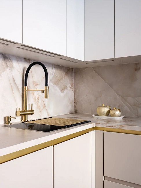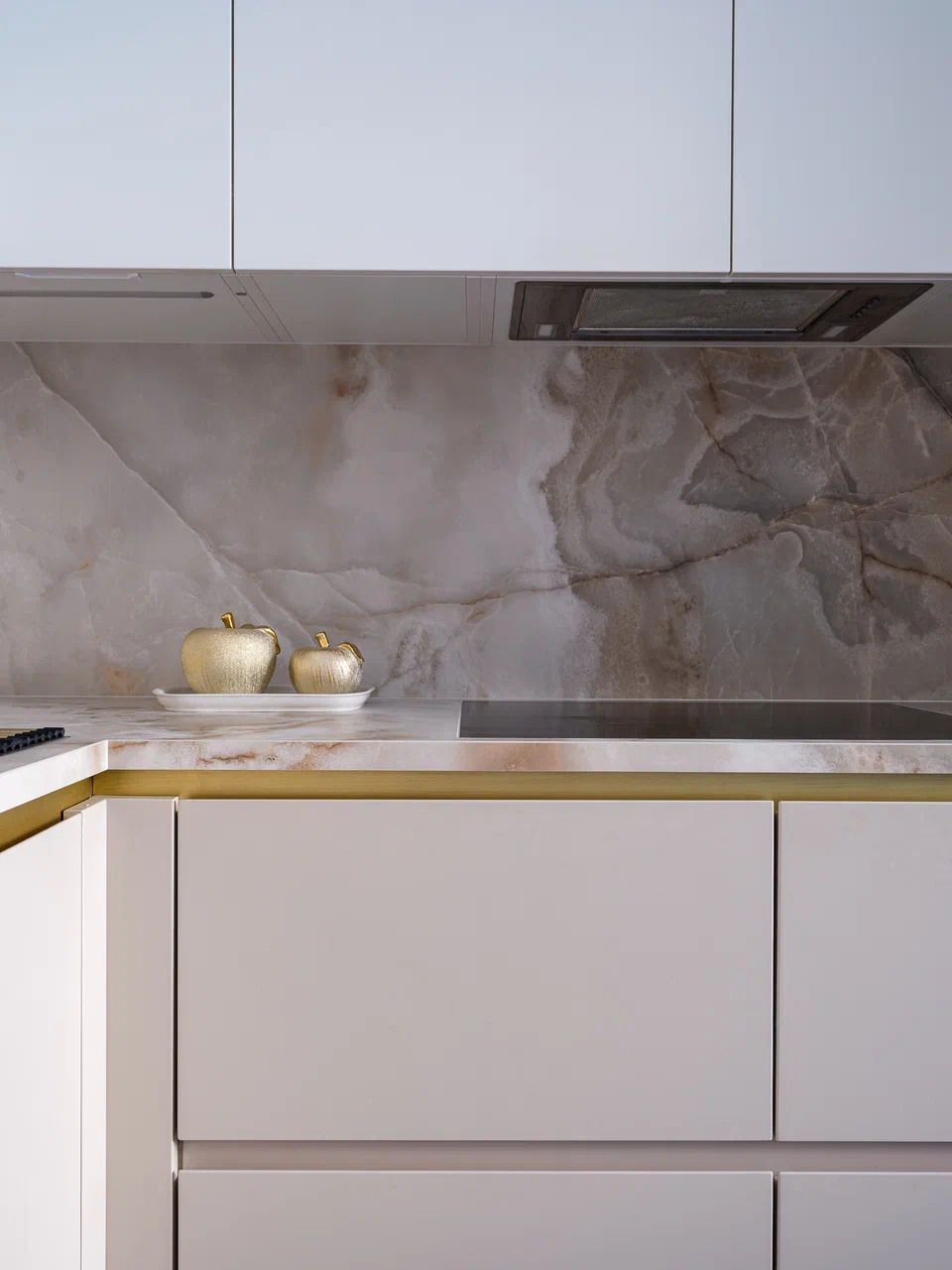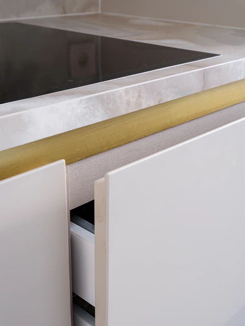 В основе нового проекта - модель кухни Maria. Ее лаконичные фасады с шелковисто-матовой поверхностью приятны на ощупь и покрыты эмалью с двух сторон. Светлая палитра создает ощущение простора, наполняя пространство легкостью и воздухом, а верхние фасады с декоративной волной вносят в интерьер динамику. Завершающий штрих – акценты под латунь.
