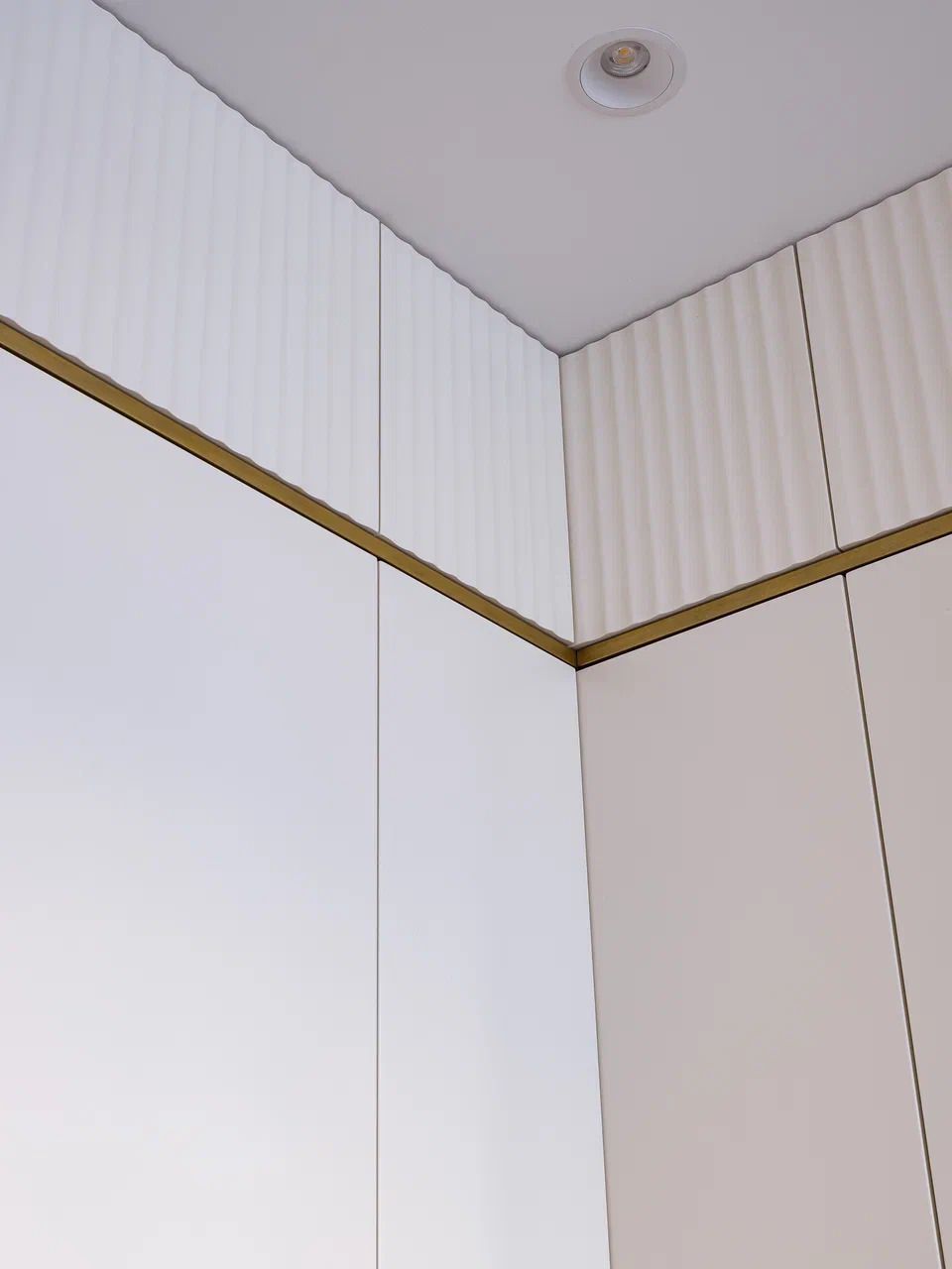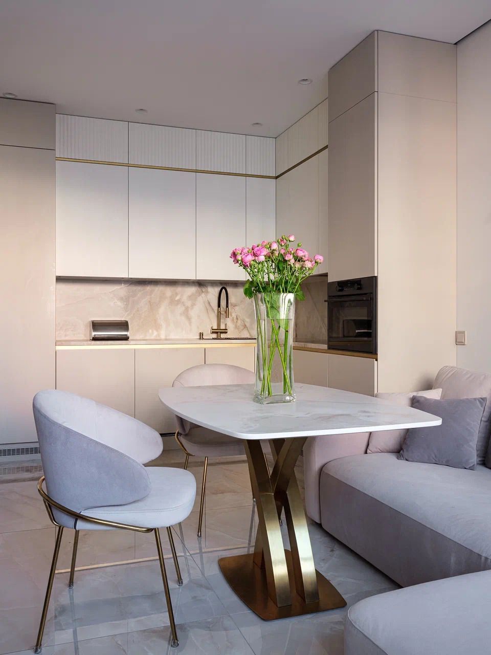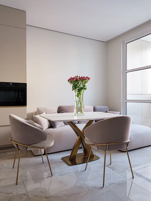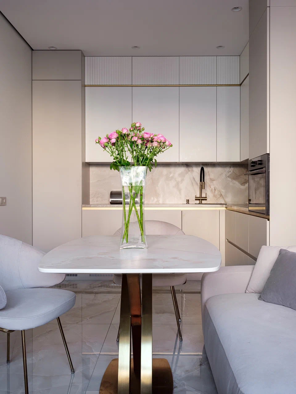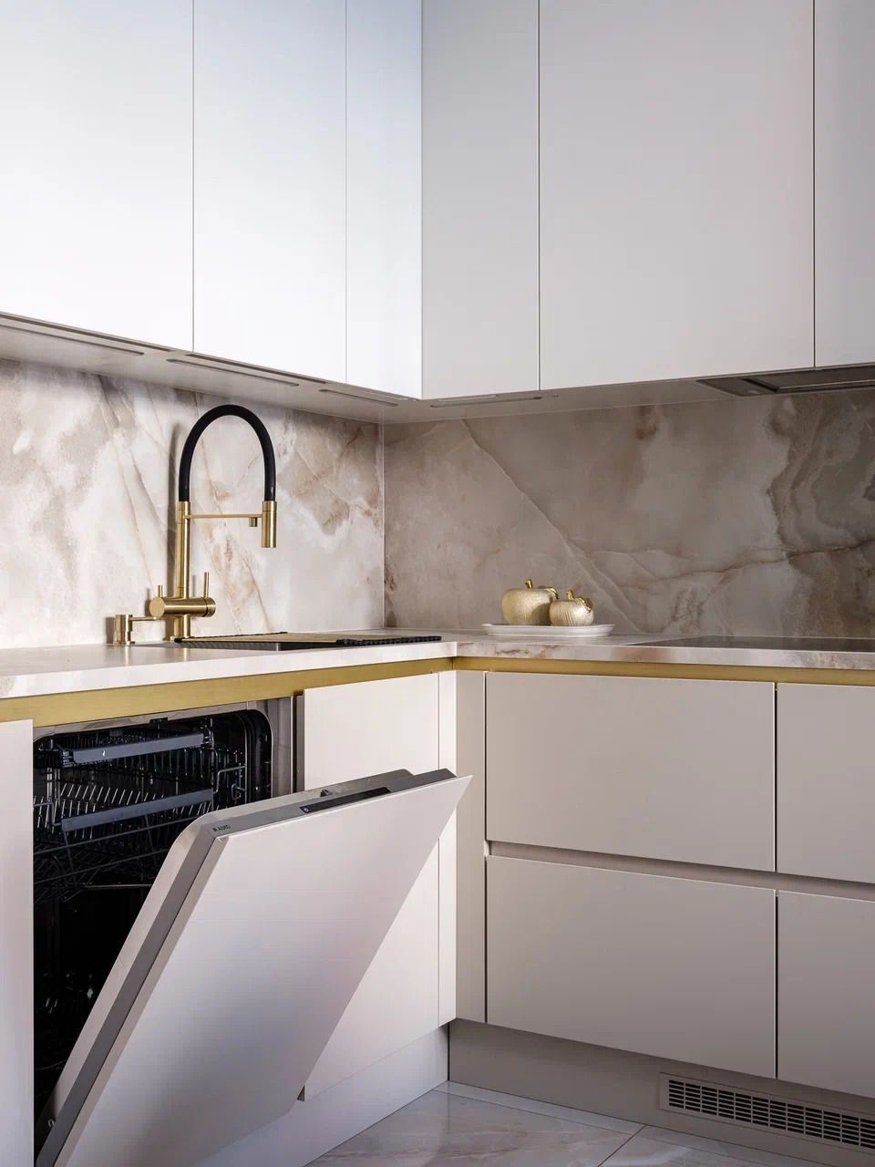 В основе нового проекта - модель кухни Maria. Ее лаконичные фасады с шелковисто-матовой поверхностью приятны на ощупь и покрыты эмалью с двух сторон. Светлая палитра создает ощущение простора, наполняя пространство легкостью и воздухом, а верхние фасады с декоративной волной вносят в интерьер динамику. Завершающий штрих – акценты под латунь.