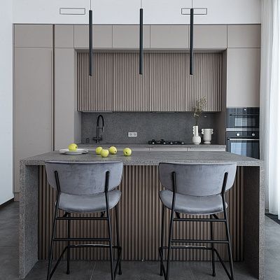 Помещение кухни – гостиной, предназначенной для семьи из 3х человек, имеет вытянутую форму. Заказчики сразу отказались от установки обеденного стола в пользу функционального полуострова. Он разграничивает зону гостиной и кухни, играет роль барной стойки, а также имеет полноценные места для хранения.