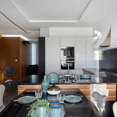 Украшением и центром всего пространства стала П-образная кухня Elisaveta light со столешницей из натурального мрамора. Короб для вытяжки был выполнен по эскизам дизайнера.